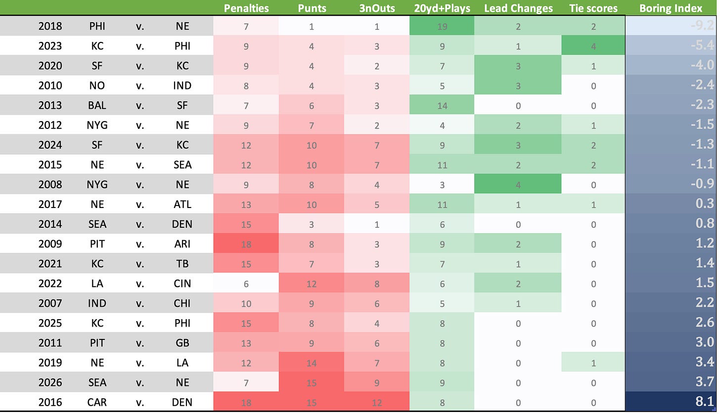 Each variable is standardized (so they’re on the same scale) and then summed into a single index. Higher values mean more boring. Applying this to the past 20 Super Bowls produces the table below.